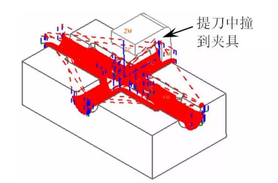 如下圖所示的情況是由于安全高度設(shè)置不當(dāng)而造成的過(guò)切。