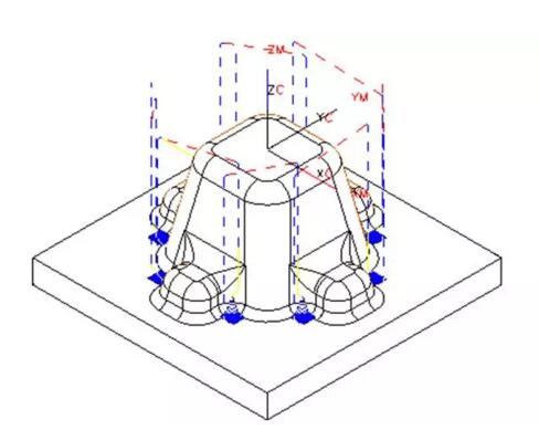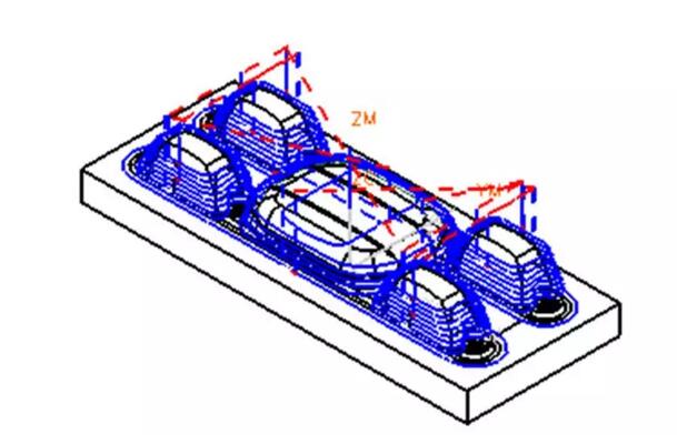 如圖下圖所示的模型,半精加工時(shí)不能選擇所有的曲面進(jìn)行等高輪廓銑加工,否則將產(chǎn)生過(guò)多空刀。