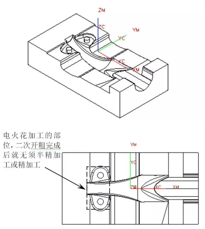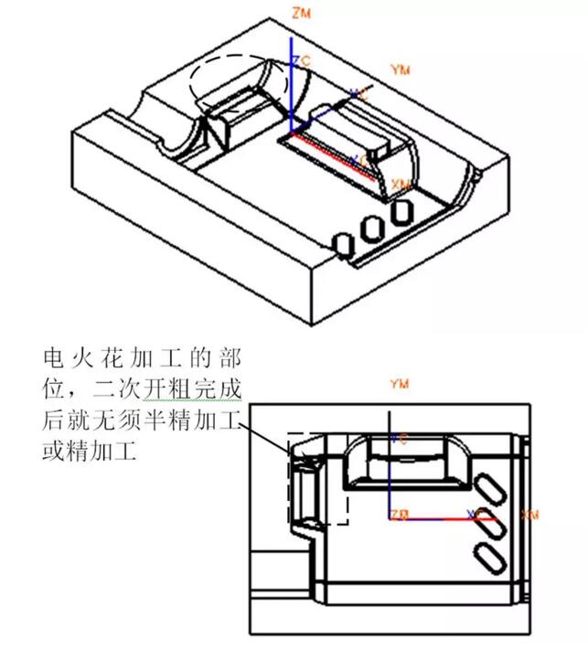 有些模具的重要部位或者普通數(shù)控加工不能加工的部位都需要進(jìn)行電火花加工,所以在開(kāi)粗或半精加工完成后,這些部位就無(wú)須再使用刀具進(jìn)行精加工,否則就是浪費(fèi)時(shí)間或者造成過(guò)切。如下面所示的模具部位就無(wú)須進(jìn)行精加工。
