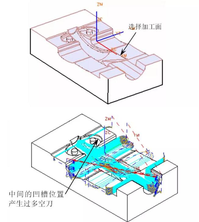 空刀是指刀具在加工時(shí)沒(méi)有切削到工件,當(dāng)空刀過(guò)多時(shí)則浪費(fèi)時(shí)間。產(chǎn)生空刀的原因多是加工方式選擇不當(dāng)、加工參數(shù)設(shè)置不當(dāng)、已加工的部位所剩的余量不明確和大面積進(jìn)行加工,其中選擇大面積的范圍進(jìn)行加工最容易產(chǎn)生空刀。