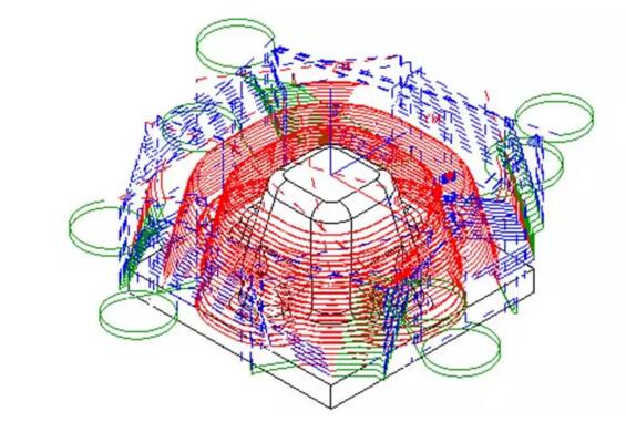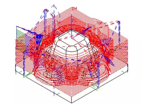 編程時(shí),一定要認(rèn)真細(xì)致,完成程序的編制后還需要詳細(xì)檢查刀路以避免過(guò)切等現(xiàn)象的發(fā)生,否則模具報(bào)廢甚至機(jī)床損壞。