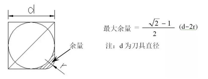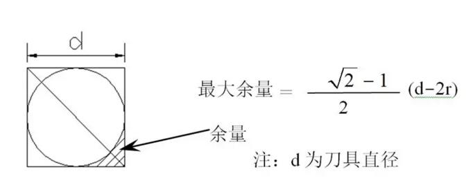 把刀具看作是圓柱體,則刀具在直角上留下的余量可以根據(jù)勾股定理進(jìn)行計(jì)算,如 下圖所示。