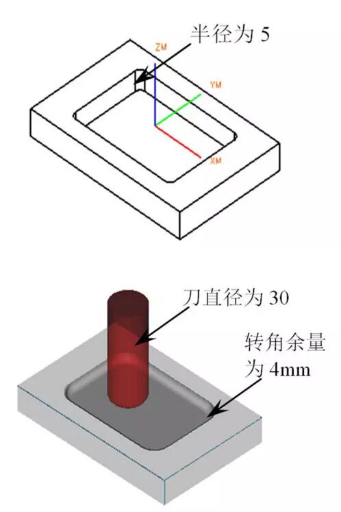 如圖下圖所示的模型,其轉(zhuǎn)角半徑為5mm,如使用D30R5的飛刀進(jìn)行開(kāi)粗,則轉(zhuǎn)角處的殘余量約為4mm;當(dāng)使用D12R0.4的飛刀進(jìn)行等高清角時(shí),則轉(zhuǎn)角處的余量約為0.4mm;當(dāng)使用D10或比D10小的刀具進(jìn)行加工時(shí),則轉(zhuǎn)角處的余量為設(shè)置的余量,當(dāng)設(shè)置的余量為0時(shí),則可以完全清除轉(zhuǎn)角上的余量。