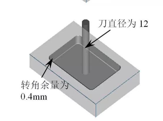 為了提高加工效率,一般會(huì)使用較大的平底刀或圓鼻刀進(jìn)行光平面,當(dāng)轉(zhuǎn)角半徑小于刀具半徑時(shí),則轉(zhuǎn)角處就會(huì)留下余量,如下圖所示。