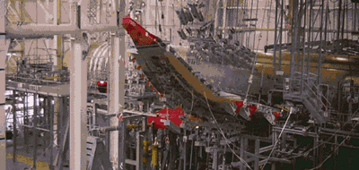 飛機在進行靜力試驗時,被“五花大綁”固定起來。而機翼部分被多條鋼纜吊起來,像小鳥揮舞翅膀一樣上下擺動,其彎曲變形幅度之大令人驚嘆,讓人不禁要問:飛機機翼到底能彎曲到什么程度?