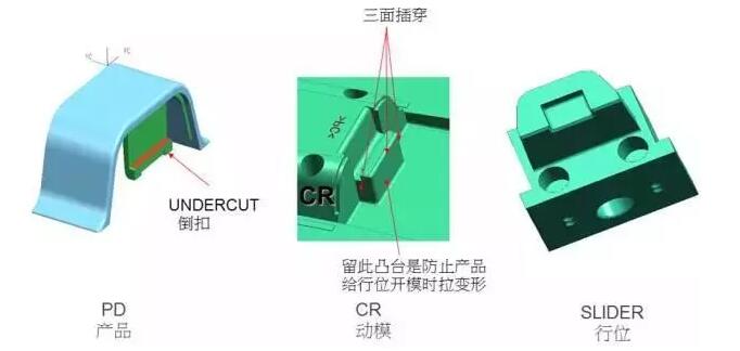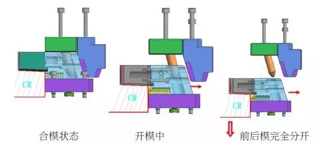 在塑料模具中,利用成型的開模動(dòng)作,使斜撐梢與滑塊產(chǎn)生相對(duì)運(yùn)動(dòng)趨勢(shì),使滑塊沿開模方向及水平方向的兩種運(yùn)動(dòng)形式,使之脫離倒勾。如下圖所示:
