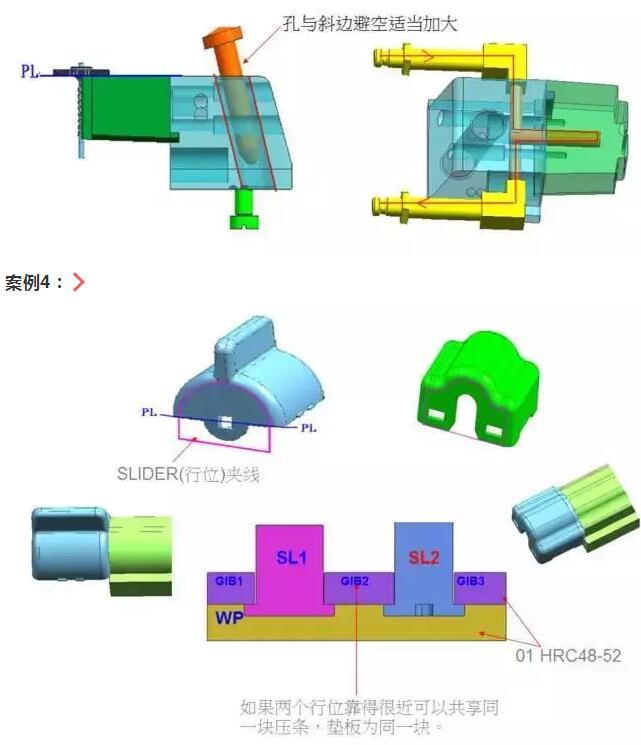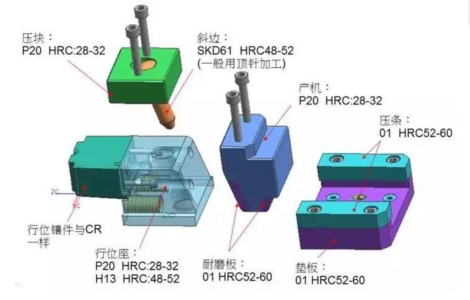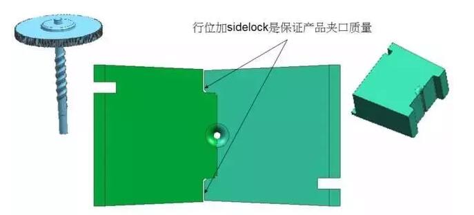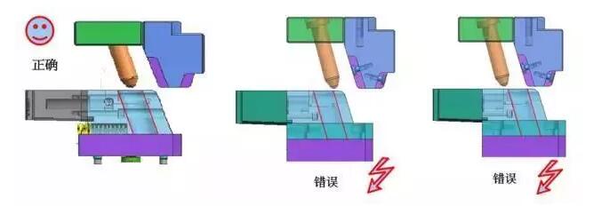 滑塊在開模過程中要運(yùn)動(dòng)一定距離,前后模完全分開后,要使滑塊能夠安全回位。滑塊要停在正確的位置,如果滑塊再往前或向后滑行,會(huì)導(dǎo)致合模時(shí)斜邊與孔對(duì)不準(zhǔn)發(fā)生相撞!所以必須給滑塊安裝定位裝置,且定位裝置必須靈活可靠,保證滑塊在原位不動(dòng)。