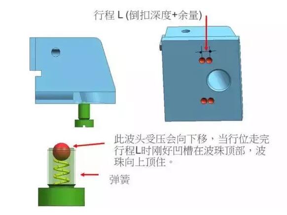 優(yōu)點(diǎn)為加工方便,操作簡(jiǎn)單;缺點(diǎn)就是它容易損壞。常用于在X方向(水平)的小行位、行程偏大的行位。它還可以幫助行位延時(shí)開模,因?yàn)樾边厸]有起作用時(shí)波珠會(huì)頂住行位不讓動(dòng)。