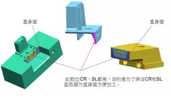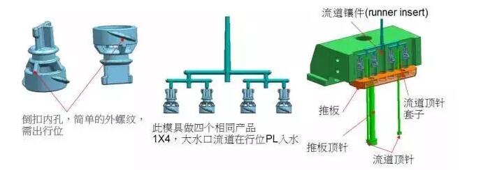 為了防止產(chǎn)品粘前模所以設(shè)計(jì)行位延時(shí)開模,前后模已打開一部分但是行位還沒有滑動(dòng),通過行位把產(chǎn)品夾住(有扣位)保證產(chǎn)品在后模。產(chǎn)品柱子大部分在行位上,所以行位要設(shè)計(jì)運(yùn)水冷卻!