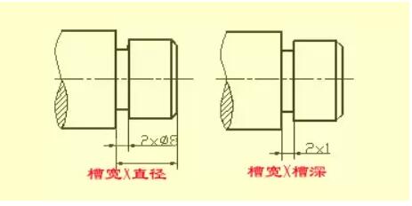 車削外圓時的退刀槽,其尺寸一般可按"槽寬×直徑"或"槽寬×槽深"方式標注。磨削外圓或磨削外圓和端面時的砂輪越程槽。