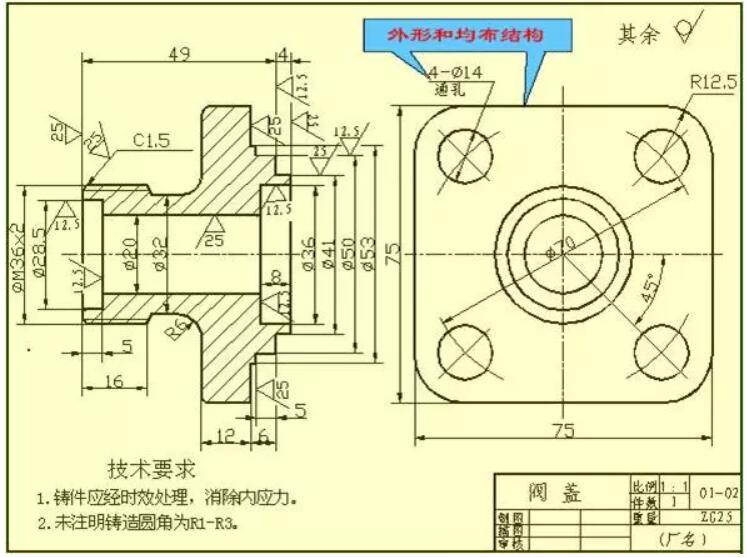 這類零件的基本形狀是扁平的盤狀,一般有端蓋、閥蓋、齒輪等零件,它們的主要結構大體上有回轉體,通常還帶有各種形狀的凸緣、均布的圓孔和肋等局部結構。在視圖選擇時,一般選擇過對稱面或回轉軸線的剖視圖作主視圖,同時還需增加適當的其它視圖(如左視圖、右視圖或俯視圖)把零件的外形和均布結構表達出來。如圖中所示就增加了一個左視圖,以表達帶圓角的方形凸緣和四個均布的通孔。