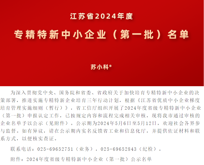近日,省工業(yè)和信息化廳關(guān)于組織開展2024年度省級專精特新中小企業(yè)(第一批),專精特新中小企業(yè)名單進(jìn)行公示。