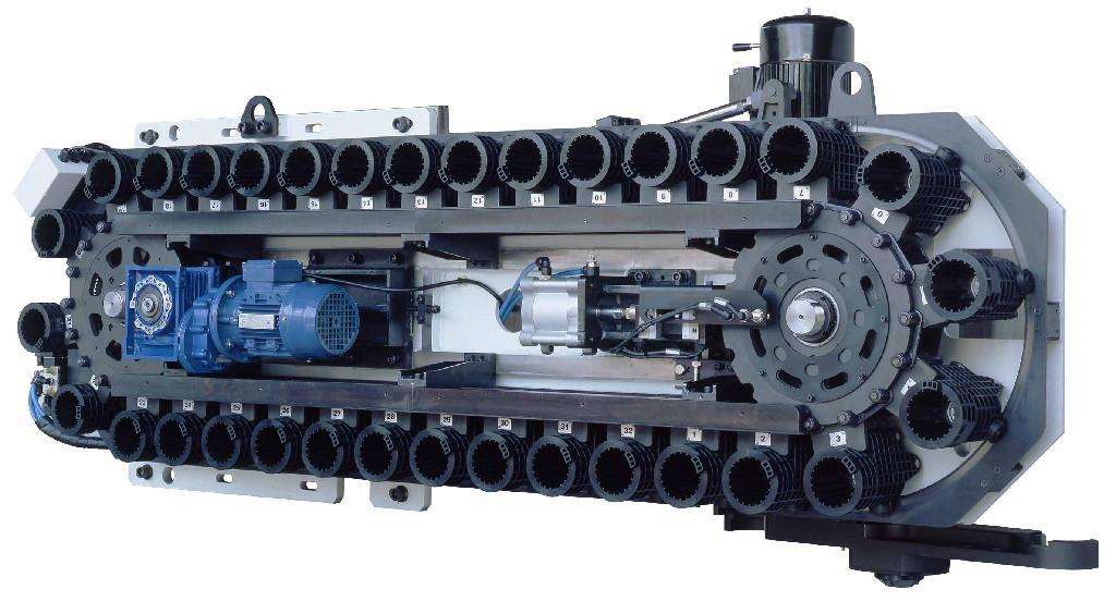 鏈式刀庫是較常用的形式。這種刀庫刀座固定在環(huán)形鏈節(jié)上。常用的有單排鏈式刀庫,如圖h所示。這種刀庫使用加長鏈條,讓鏈條折疊回繞可提高空間利用率,進一步增加存刀量,如圖i所示。鏈式刀庫結構緊湊,刀庫容量大,鏈環(huán)的形狀可根據(jù)機床的布局制成各種形狀。同時也可以將換刀位突出以便于換刀。在一定范圍內,需要增加刀具數(shù)量時,可增加鏈條的長度,而不增加鏈輪直徑。因此,鏈輪的圓周速度(鏈條線速度)可不增加,刀庫運動慣量的增加可不予考慮。這些為系列刀庫的設計與制造提供了很多方便。一般當?shù)毒邤?shù)量在30~120把時,多采用鏈式刀庫。
