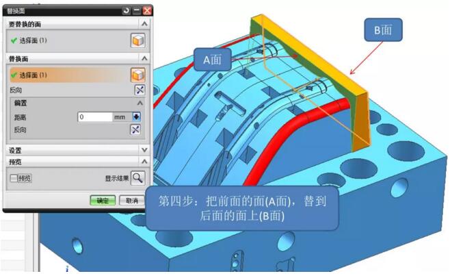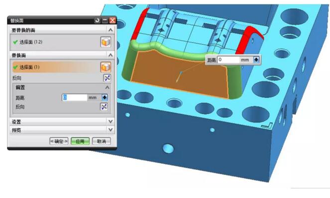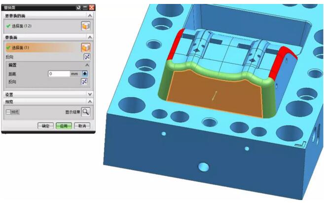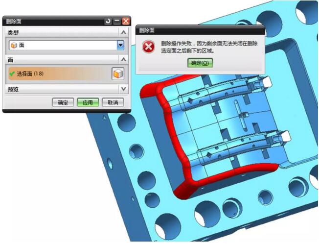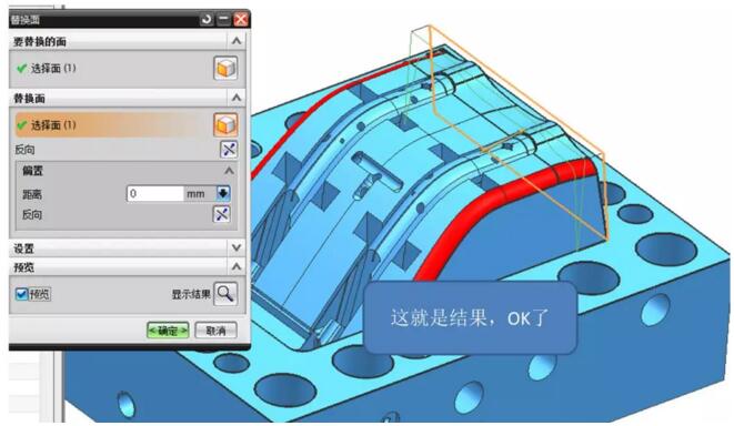 看到沒,那里報警了,啥原因?替換的原理,是把我們選擇的目標面,做平我們指定的面,在這個過程中,它周圍相關的面必須要延伸或縮短,才能形成新的面,在這個過程中,由于公差,或者面的質量,或者與旁邊的孔或其它特征有干涉直接難以成型時,就不能生成新的面了。至于到底是什么原因造成這個問題時,工作中,很難有這么多時間去研究清楚。我們一般是直接選其它方法來完成。